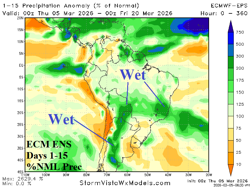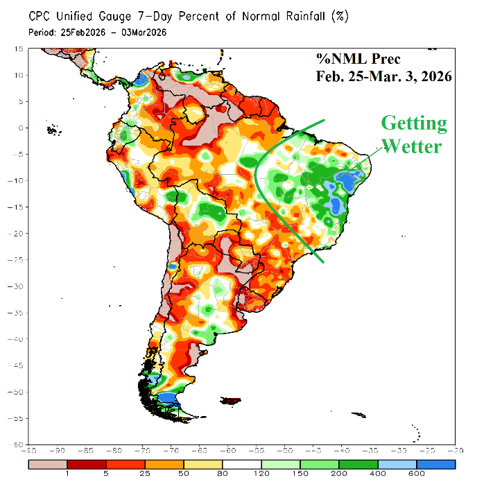 Highlight: Northeast Brazil continues to trend wetter, expansion of wet pattern expected in South America. Tropical cyclones soak North/Northeast Australia.