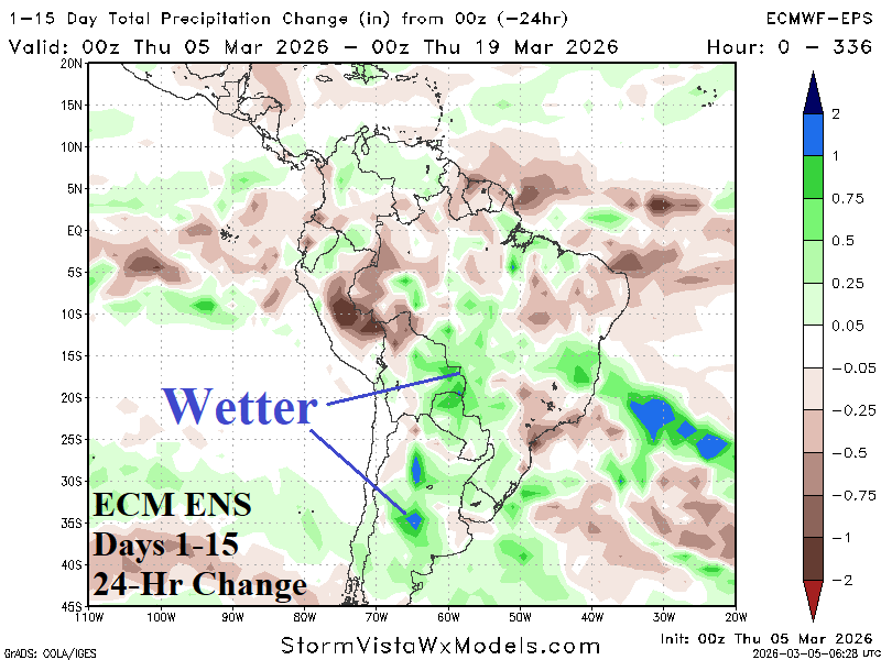 Discussion: Northeast Brazil continues to shift much wetter (Fig. 1). Parts of Northeast Argentina are (also) recently wetter. The 15-day forecast utilizing ECM ENS indicates a wet regime across southwest to eastern Brazil AND much of Argentina (Fig. 2). Exceptions are Northeast Argentina, Uruguay, and far Southeast Brazil. The 24-hour forecast change is generally wetter (Fig. 3). One catalyst to the wetter pattern is the steadily warming Nino12 SSTA region off the northwest coast of South America adding moisture to the South America climate. Keep in mind, the wet forecast bias by all models remains. ECM ENS has the least vibrant wet bias in 15-day outlooks from the past 30 days (Fig. 4). All 16-30-day forecasts (ECM, CFS, GFS ENS, and Graph Cast) are drier for both Argentina and Brazil. However, forecasts are generated with below normal forecast confidence due to a lingering (weak) La Nina climate (as identified by ongoing positive phase southern oscillation index) combined with the confusion of an El Nin-like warming of the Nino12 SSTA region.
