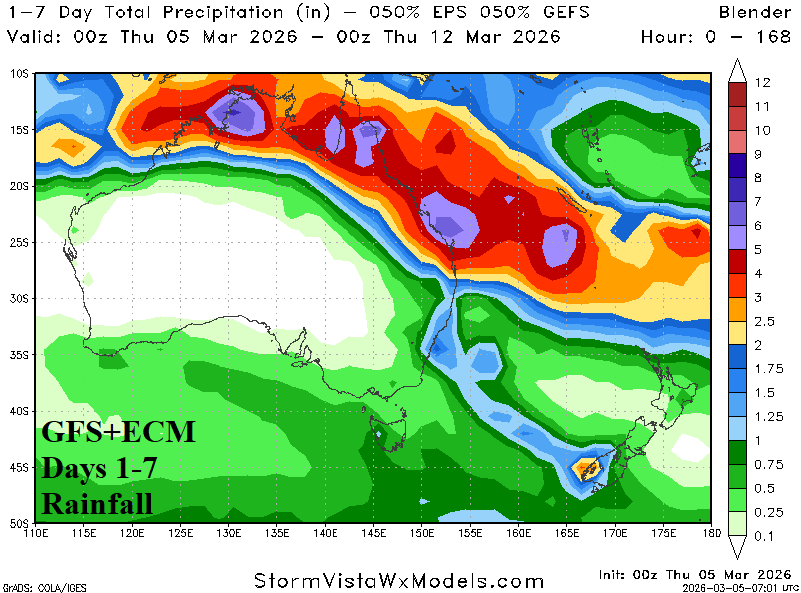 Fig. 5-6: GFS+ECM 14-day rainfall amount forecast across Australia.