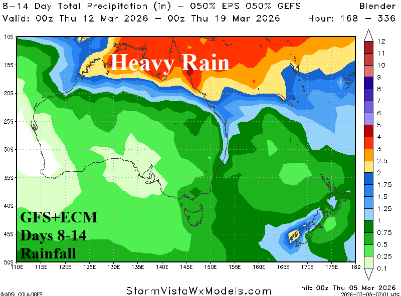In Australia, heavy rain associated with tropical systems affects the north and northeast coast of the continent through the weekend an into early next week (Fig. 5). The frequent tropical cyclone presence is due to the ongoing nearby convection phase of the Madden Julian oscillation (MJO). Although tropical cyclone presence eases in the 8-14-day period, heavy rains will continue in the North (Fig. 6).