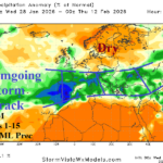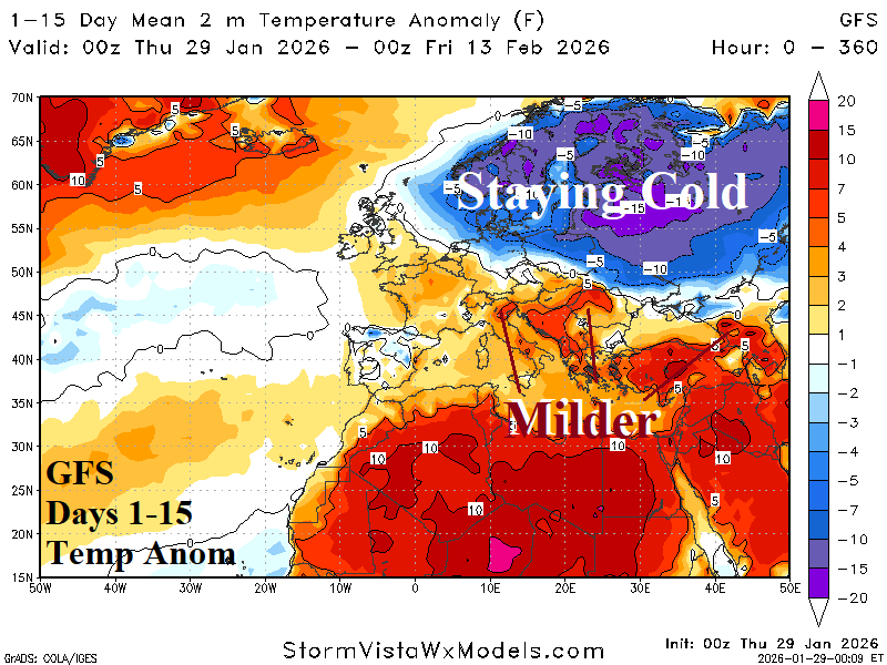 The ongoing strong negative arctic oscillation (-AO) continues to cause problematic weather across Europe. An increasingly well-established storm track has evolved across West and South Europe during the past week (Fig. 4). The Southern Europe storm track is likely to continue for another 2 weeks (Fig. 5). Included is a streak of heavy snow across Eastern Ukraine and Southwest Russia. The GFS maintains the cold clash across North and East Europe with a milder trend in Southeast Europe to help generate the potent storm track (Fig. 6).