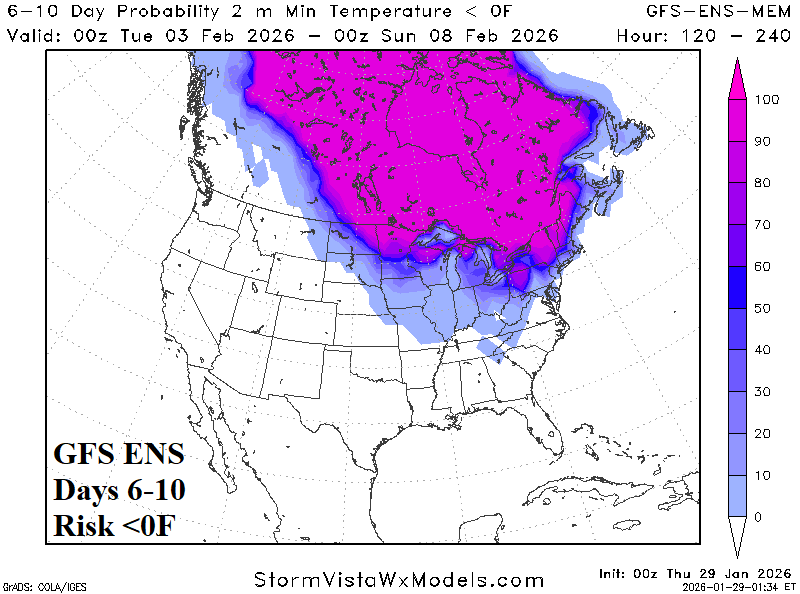 Fig. 1-3: The GFS ENS risk of <0F across the U.S. through 15 days.