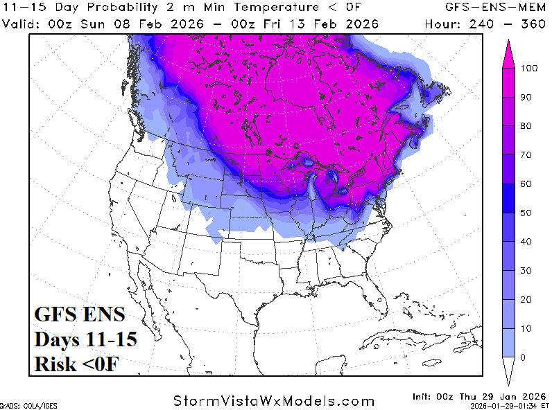 Discussion: The frigid North-central to Ohio Valley to Northeast U.S. temperature pattern, frequently producing <0F risk is likely to continue into mid-February. Overnight, already frigid risk <0F covering the Upper Midwest to Northeast U.S. the next 10 days, appears to expand slightly in the 11-15-day period (Fig. 1-3). GFS adds additional snow to the already expansive deep snow cover during the latest 15-day outlook accounting for the sustained cold.