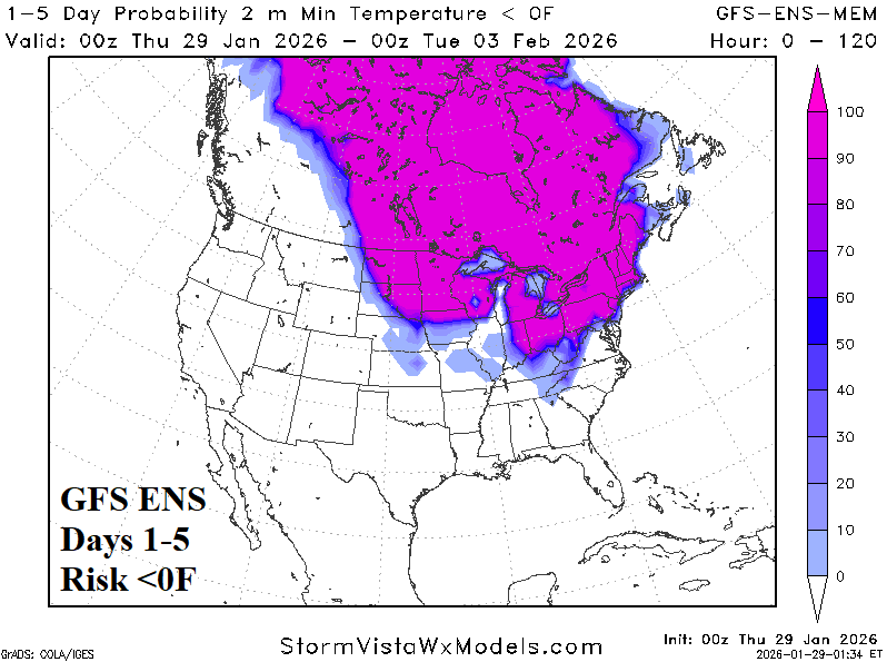 Fig. 1-3: The GFS ENS risk of <0F across the U.S. through 15 days.