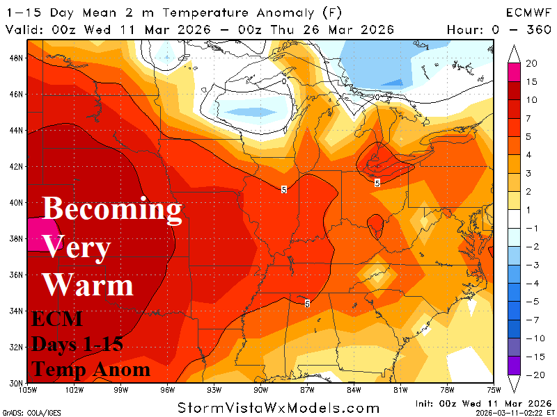 Discussion: A combination of zonal flow in the 1-5-day and 11-15-day period and titanic Southwest U.S. high pressure ridging in the 6-10-day period leaves the west and southwest Great Plains without rain and increasingly very warm in the latest ECM 15-day forecast (Fig. 1-2). Texas to Oklahoma shift wetter in the 16-30-day period while the western Great Plains stay dry and very warm. U.S. hard red winter wheat becomes a hot spot for drought development.