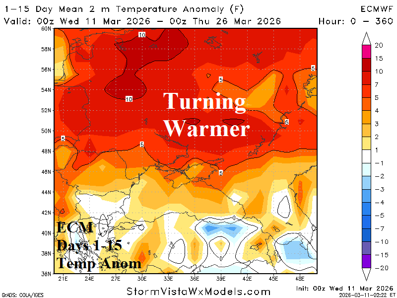 A second hot spot is recent dryness in the Black Sea region followed by (ECM) 15-day forecasts of developing anomalous warmth and steady dryness (Fig. 3-4). The dryness is north of a vigorous storm track extending across the Mediterranean Sea and into the Middle East over the next 2+ weeks. The Black Sea dryness is likely to last through the 16-30-day period.