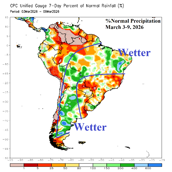 The South America 15-day rainfall forecast features beneficial amount for much of Argentina and Brazil except for Southeast Brazil (Fig. 5). The 15-day forecast follows the recent trend of increasing rainfall arcing around Southeast Brazil (Fig. 6).