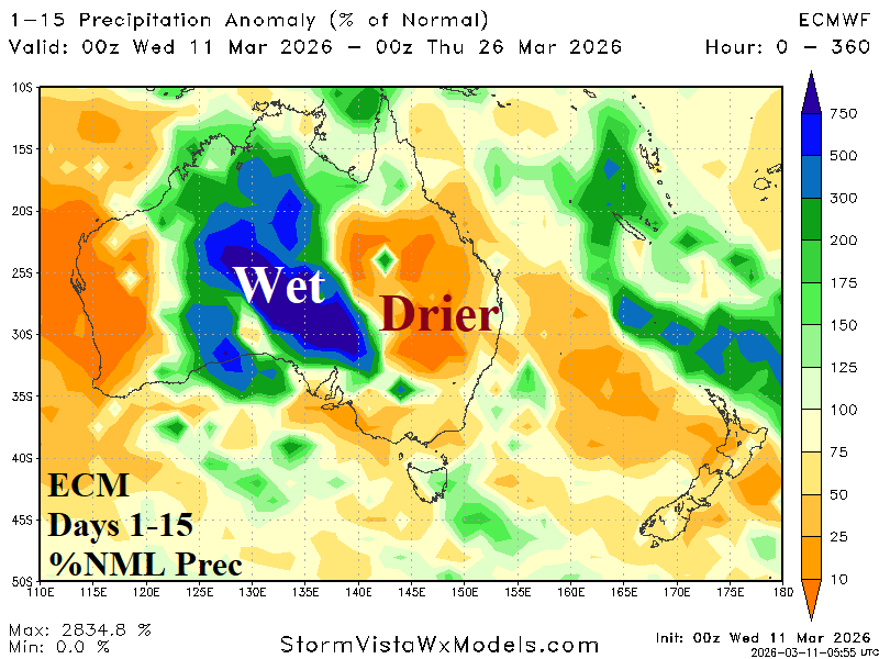 Fig. 7-8: ECM 15-day percent normal precipitation forecast across Australia and the Canadian Prairies.