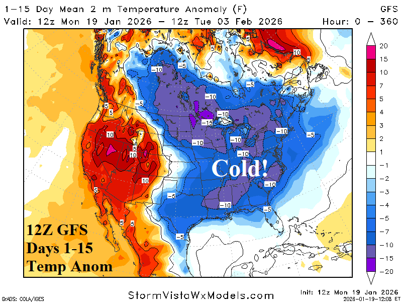 Fig. 1-3: The 15-day prohibitive -AO forecast and 12Z GFS U.S. and Europe 15-day temperature anomaly forecast.