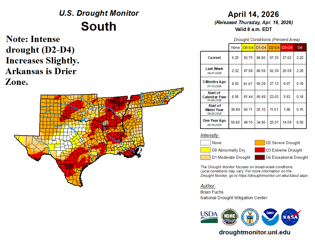 Fig. 2: U.S. Drought Monitor for the South U.S. for the week ending April 14, 2026.
