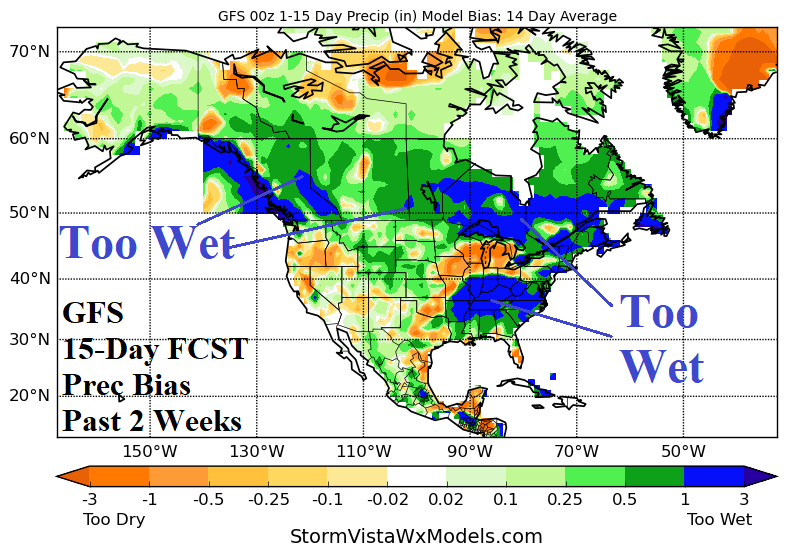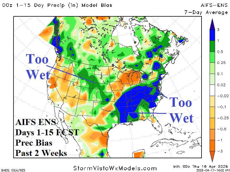 For farmers, traders and analysists, there is importance of awareness of precipitation forecast bias by all dynamic and AI forecast models during this critical time. The GFS has the wettest bias of dynamic models across Canada and the Southeast States during April (Fig. 3). Other operational models, such as ECM, are not quite as wet biased. A leading AI model, the AIFS ENS, has shown a wet bias in the Southeast U.S. although not as wet as GFS in Canada (Fig. 4) during April.