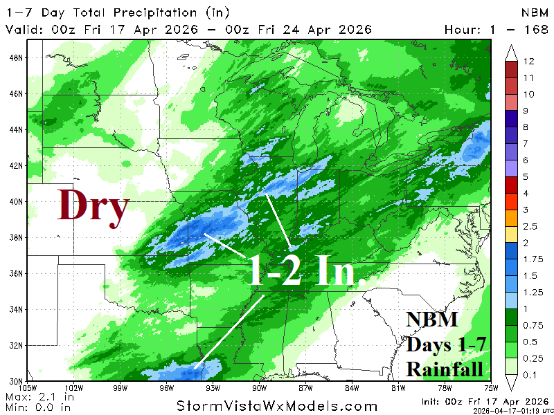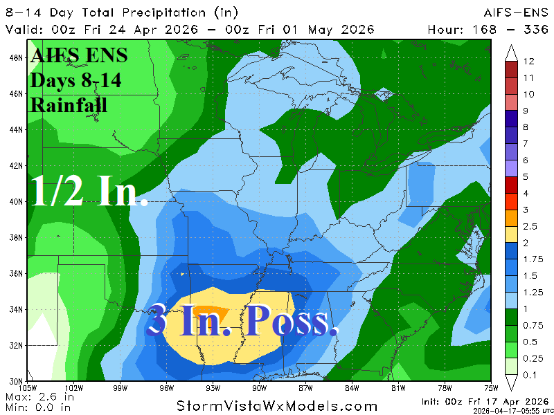 The National Blend of Models (NBM) is utilized to project 7-day rainfall across the U.S. AG Belt. The forecast emphasizes dryness for the western Great Plains and under-achieving rainfall amounts in the heaviest rainfall areas centered on the Missouri Valley (Fig. 5). In the 8-14-day period, AI models are preferred. GFS and ECM are back-and-forth on excessive rain threats. But, with rainfall forecast bias showing that forecasts are generally too wet, and lack of tropical forcing from the MJO, the less wet outlooks are preferred. AIFS ENS indicates a heavy rain risk in the Mid-south U.S. with some marginal rainfall possible in the western Great Plains (Fig. 6).