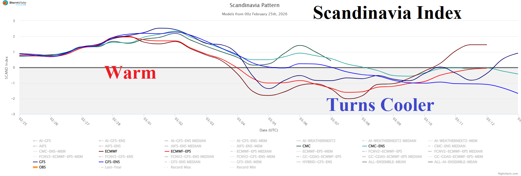 Discussion: Positive phase of the Scandinavia index (SCAND) supports anomalous warmth and dryness across much of Europe through the next week (Fig. 1). SCAND shifts to negative phase during the medium range which suggests a cooler and potentially wetter regime. The 15-day population weight Europe temperature forecast identifies the warmth through 10 days shifting cooler in the extended range (Fig. 2). ECM ENS is moderately warm in the latest 15-day outlook for Southern Europe (Fig. 3). Other models are warmer and do not indicate the decelerating warmth in the extended range. The 15-day percent normal precipitation outlook is drier than normal including Southern Europe which has observed wet climate for much of the winter season (Fig. 4). However, wet risk is maintained across Portugal and Spain.