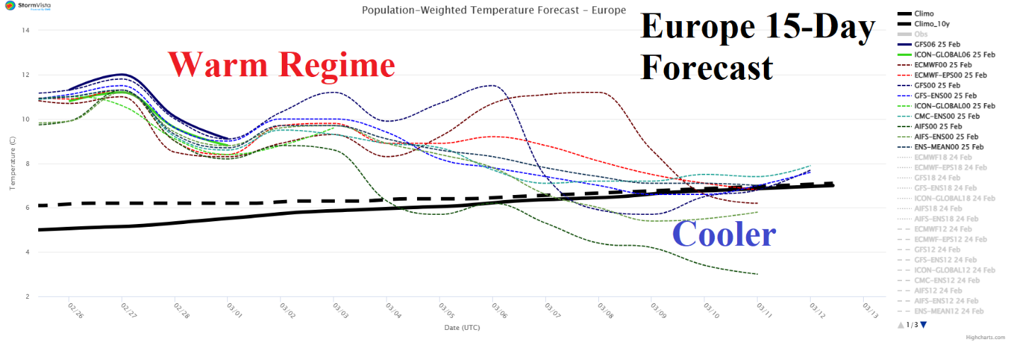 Fig. 2: The population weight daily average temperature departure from normal across Europe utilizing all models through the next 15 days.