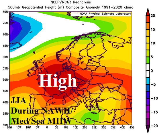 Highlight: NAWH/Mediterranean Sea MHW and influence on summer upper air pattern for Europe…Hot and dry!