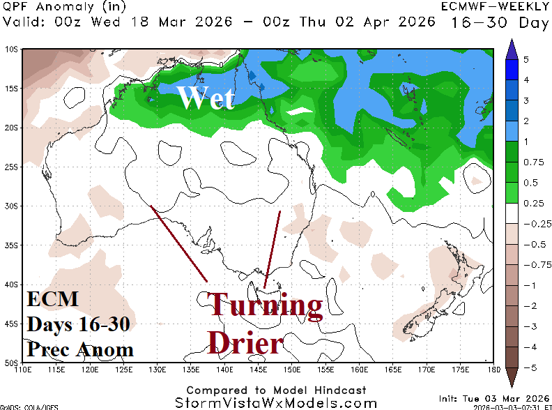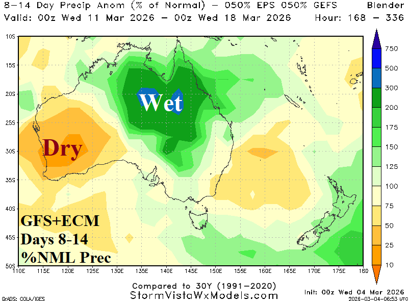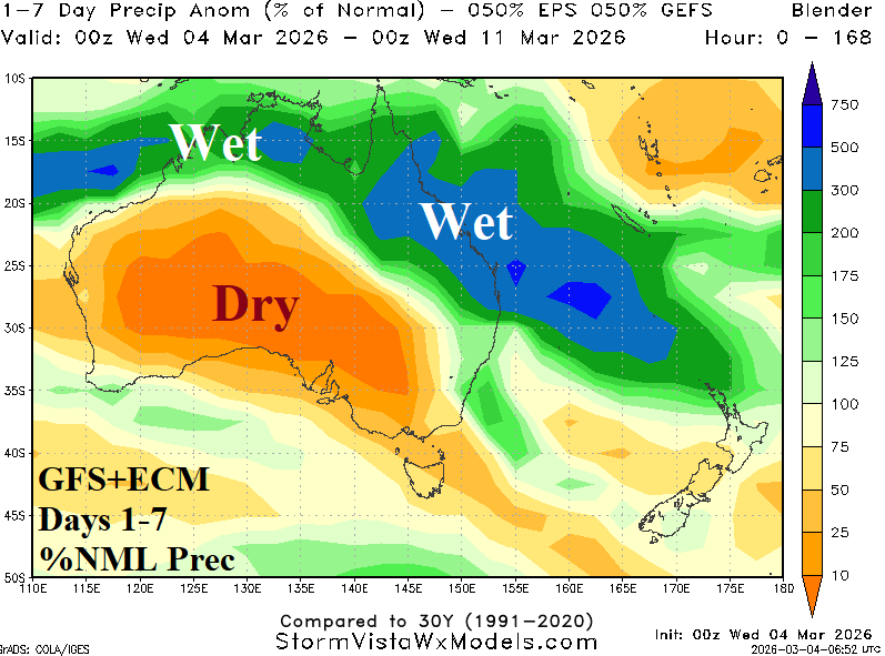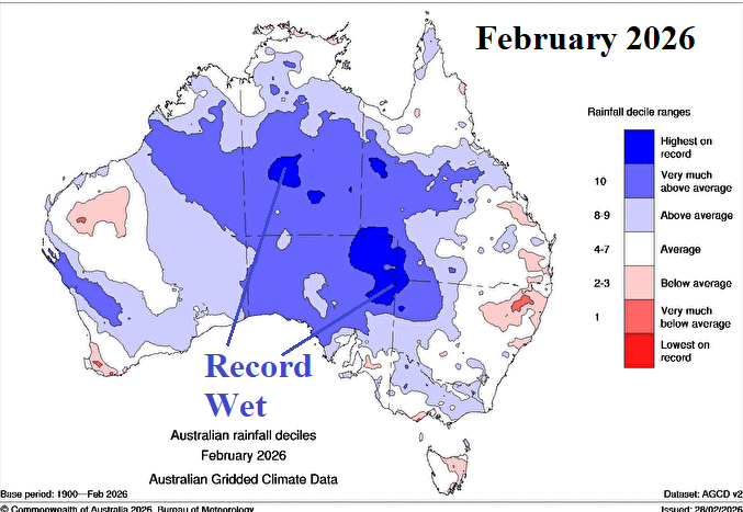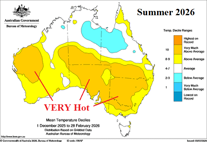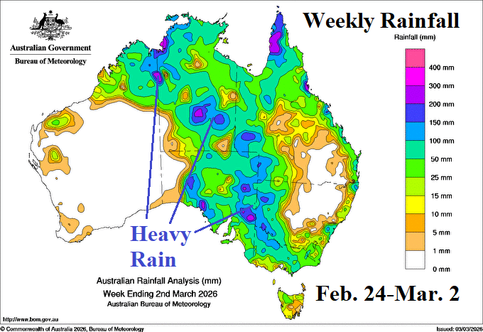 Discussion: Meteorological summer 2025-26 produced harsh climate extremes across Australia. Most of the southern half of Australia observed MUCH ABOVE normal anomalous heat (Fig. 1). The heat was accompanied by locally very dry climate in parts of Victoria and Northeast New South Wales plus Coastal Southwest Australia (Fig. 2). However, summer 2026 will be remembered for prohibitive rainfall centered on the east-central to northeast continent which became enhanced to an all-time-record level during February (Fig. 3). The late FEB/early MAR rainfall pattern indicates the recent southward shift of heavy rain continues (Fig. 4).