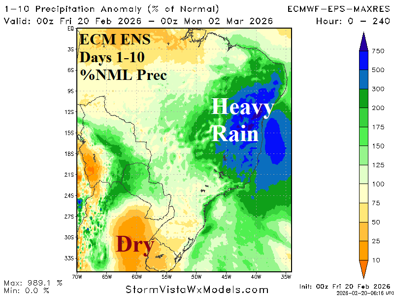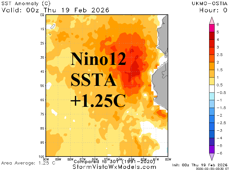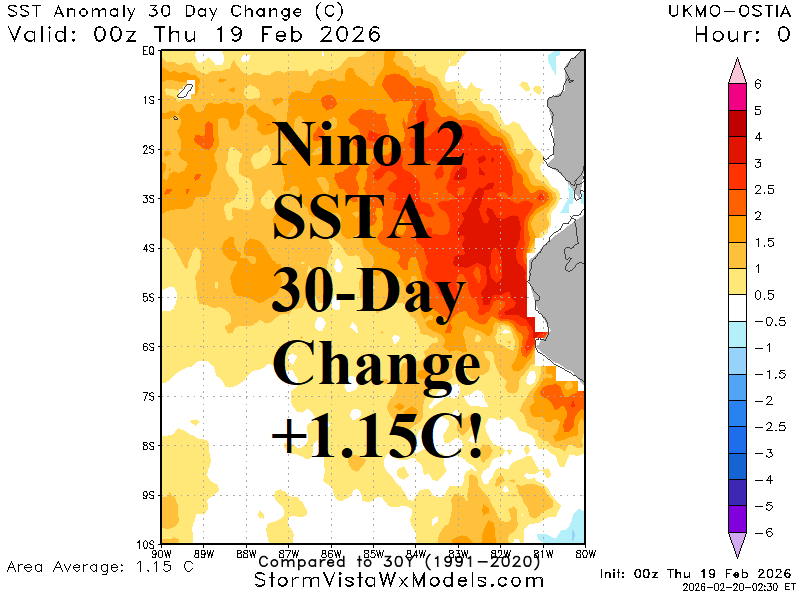 Discussion: The warming of the equatorial East Pacific Ocean subsurface caused by a robust Kelvin Wave has extended to the northwest coast of South America where the Nino12 region has warmed to 1.25C above normal (Fig. 1). The anomalous warmth is well above the El Nino threshold. The warming has generated within the past 30 days (Fig. 2). Interestingly, the warm sea surface temperature anomalies off the South America West Coast and now the Nino12 region have biased the 30-day anomalous wet rainfall pattern to the western portion of the continent (Fig. 3). To compensate the eastern half of the continent, especially Northeast Argentina has been exceptionally dry and coupled with anomalous het caused intensifying drought. There is a pattern change in the forecast. Vigorous upper troughs moving across the continent and amplifying off the East Coast entrain moisture from the warm SSTA regions and cause a heavy rain scenario across Brazil initializing this weekend and potentially lasting into early March (Fig. 4). Meanwhile, subsidence on the backside of the convective rains keeps Northeast Argentina dry!