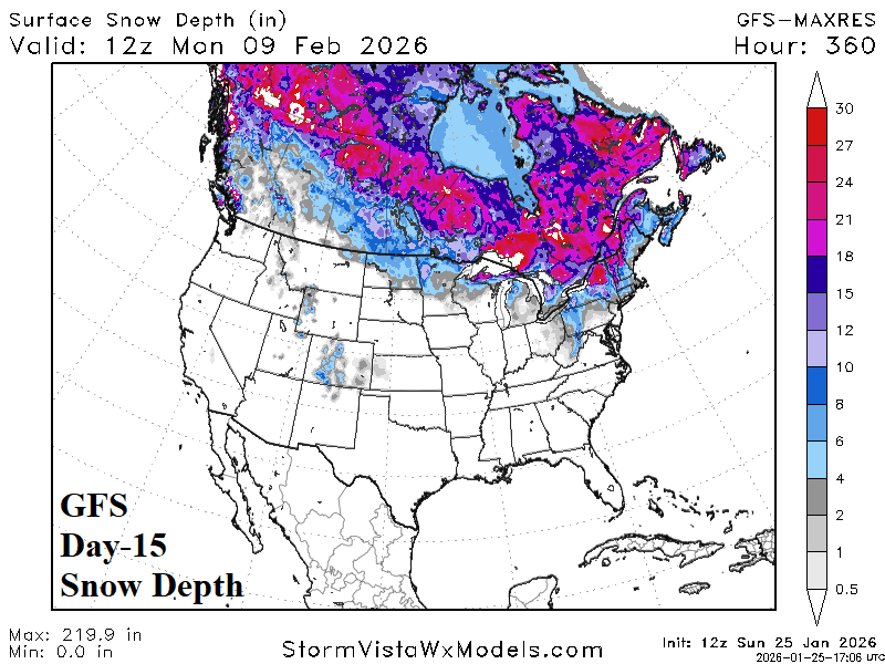 A major snowstorm struck the U.S. over the weekend. Prohibitive snow cover is indicated by GFS by dawn tomorrow except for The Central Pains where the ground is bare while encountering arctic cold (Fig. 7). In 15 days, snow cover is forecast to retreat (Fig. 8).