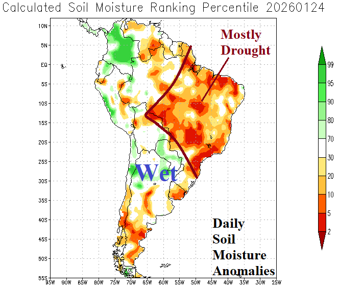 Fig. 1-2: Percent normal rainfall during the past 7 days across South America and the daily soil moisture anomalies analysis.