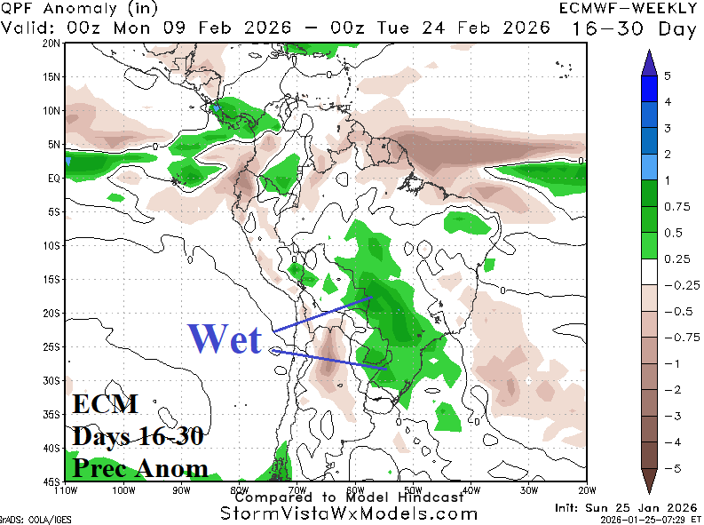 Highlight: Drier Brazil this week, some wet weather next week. ECM and AI agree on wet Brazil 16-30-day period.