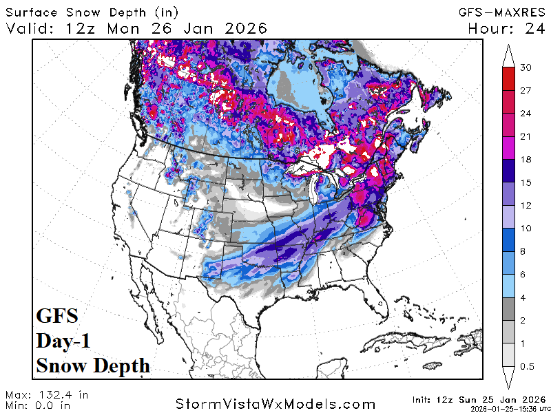 Fig. 7-8: The GFS snow depth projection for tomorrow morning and 15 days from now.