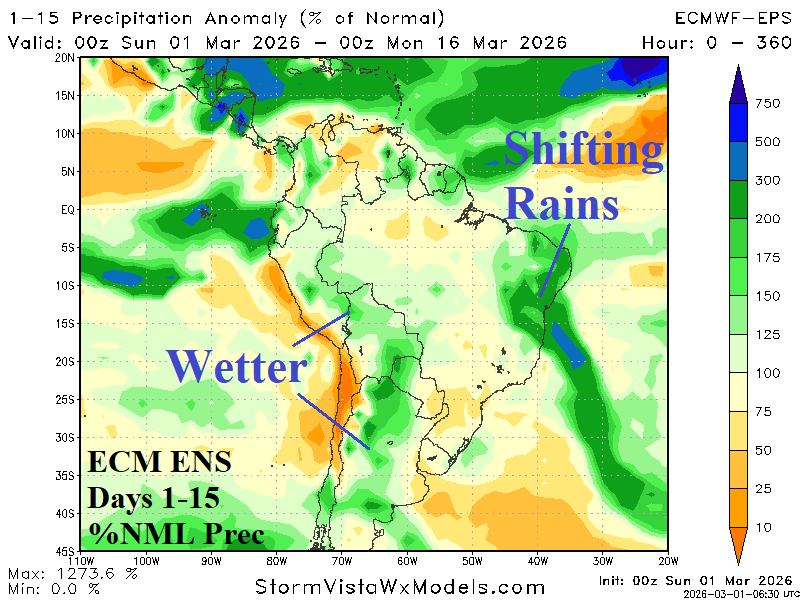 Climate implications are the soaking wet regime across much of Australia is likely to continue (Fig. 2), Argentina rains return while Brazil rains shift (Fig. 3), and the U.S. is warm with heavy rains in the East-central U.S. (Fig. 4-5).