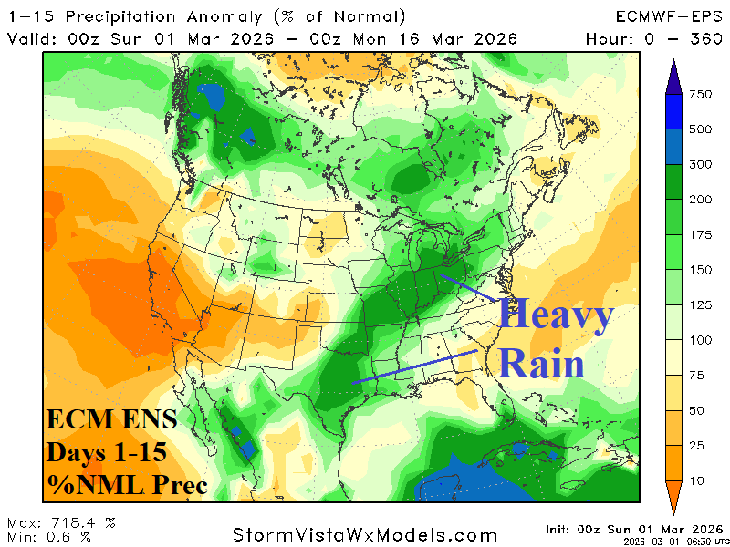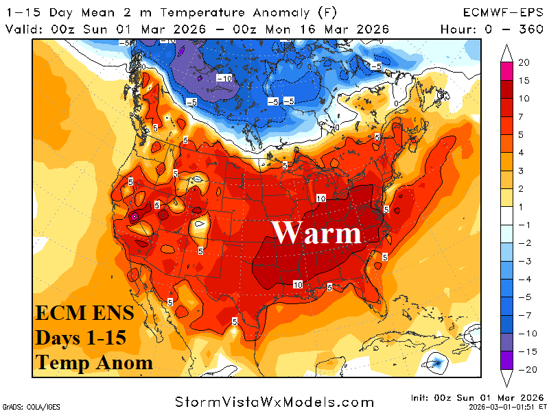 Discussion: During February, robust warming of the equatorial Pacific Ocean subsurface was observed and supports an El Nino ahead climate signal (Fig. 1). The last months when the entire equatorial Pacific subsurface were warmer than +1.0C was observed during April-June 2023 when Nino34 SSTA was +0.88C by June on the way to +1.99C by December. Multivariate ENSO index (MEI) shifted to an El Nino supporting +0.5 in June (2023) peaking at +1.1 in December. Interestingly, although oceanic El Nino 2023-24 was quite strong the atmospheric reaction to the tropical ocean warming was not nearly as potent. Speculated is oceanic warming poleward of the tropics may have weakened the El Nino climate signal. Reasonable is a similar scenario for 2026-27 as current equatorial subsurface warming suggests oceanic El Nino by June followed by peak strength late 2026. MEI remains in a La Nina signature (-0.8) and is likely to lag the anticipated Nino34 SSTA warming in 2026. Global SSTA is about twice as warm (now) than March 1, 2023.