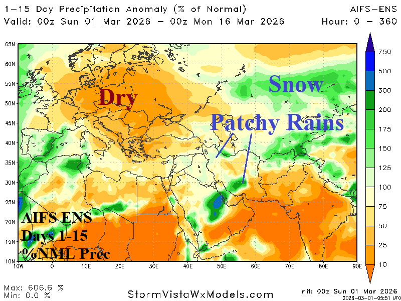 In Europe, mild and dry weather dominates during the next 15 days (Fig. 6-7). Arctic air in West-central/Central Russia loses some intensity after 10 days shows no sign of shifting toward Europe. Southwest Europe is wet at times while patchy showers affect the Middle East, and a snowy regime will hover over Southern Russia.