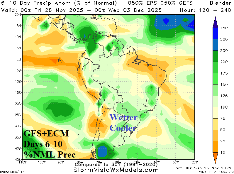 Discussion: Combining equally the GFS and ECM produces a dry and hot forecast across Argentina while East Brazil is wetter than normal (Fig. 1). An interruption in this (new) pattern appears in the 6-10-day forecast as widespread rain affects both Argentina and Brazil (Fig. 2). Additionally, Argentina is cooler due to the precipitation. In the 11-15-day forecast, the dryness and heat regenerate in Argentina while East/Northeast Brazil are wet again (Fig. 3). The wettest 16-30-day forecast is the NCEP CFS V2 which indicates above normal rainfall across much of Brazil with some dryness in Northeast Argentina (Fig. 4). Other models such as ECM and Graph Cast are much drier Southeast Brazil and Northeast Argentina.