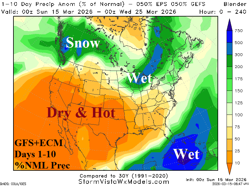 The U.S. precipitation outlooks feature dry and warm-to-hot persistence across the Southwest U.S. spreading into the central and southern Great Plains during the next 10 days (Fig. 5). In the 11-15-day period, wet weather developing in Mexico extends northward into Texas and possibly the southwestern Great Plains (Fig. 6). In early April, “weeklies” models agree on a wetter Central U.S. pattern developing.