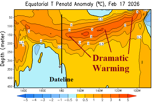 Fig. 2-3: The eastern equatorial Pacific Ocean is warming dramatically signaling El Nino risk ahead. Analog years with a La Nina to El Nino (by mid-year) transition precipitation tendency for JUN-SEP is indicated.