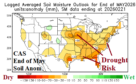 The subsurface equatorial East Pacific continues to warm dramatically (Fig. 2). AG Markets are generally aware of impending ENSO phase change mid-to-late 2026 to El Nino which implies a change in areas affected by drought while some areas with drought receive beneficial rain. A preliminary analog on the potential U.S. precipitation change is based on the presence of La Nina followed by a change to El Nino during the middle third of the year. The only analog years taken from the past 3 decades with the described qualifiers are 1997 and 2023. The consensus of each analog year implies worsening drought risk in Iowa and the Gulf States while the wet bias develops and expands across the West U.S. reaching parts of the western Great Plains during the JUL-SEP warm season (Fig. 3). NCEP SPI6 and CAS soil moisture outlooks for May favor drought risk for much of the Great Plains eastward to the Atlantic Coast (Fig. 4-5). El Nino-related influence on precipitation regimes is strongest during the cold season.