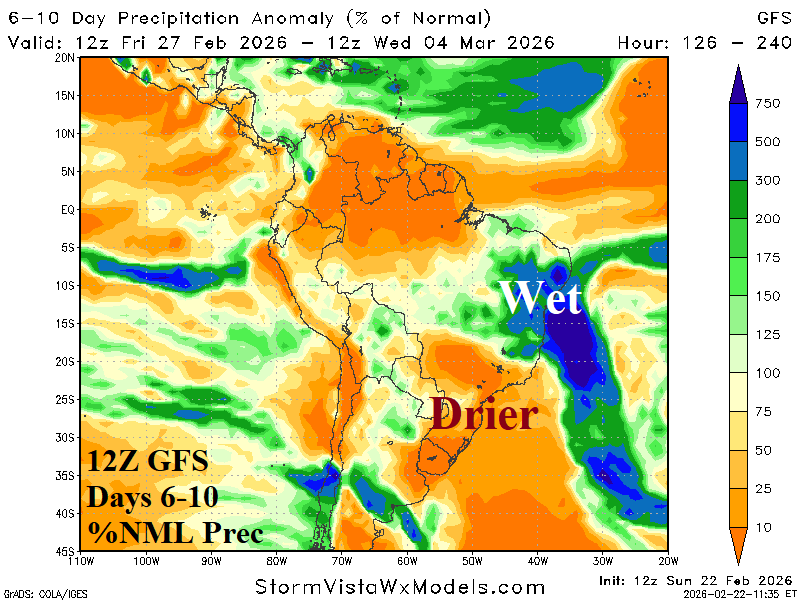 Weather satellite reveals copious heavy rain developing across Brazil at midday confirming the excessive amount forecast via the 12Z GFS (Fig. 6). The 6-10-day forecast pushes the heavy rain into Northeast Brazil leaving Southeast Brazil drier (Fig. 7). Thunderstorm streaks appear in Central Argentina next weekend. In the 11-15-day period, the trend is wetter in Argentina (Fig. 8).