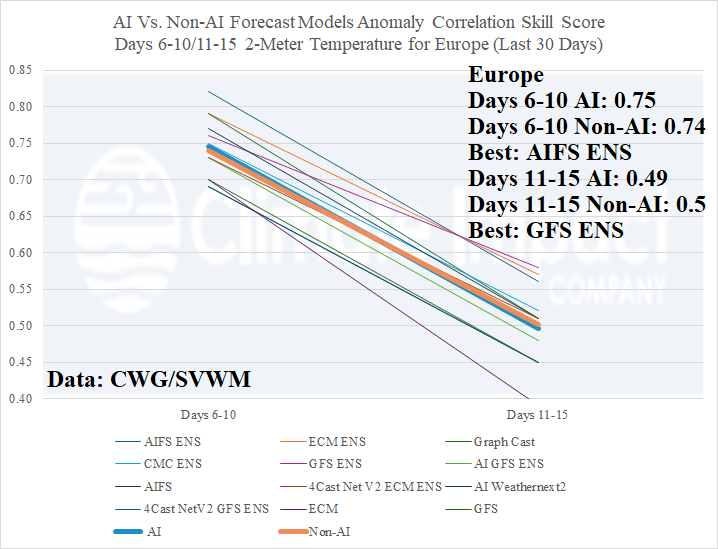 Discussion: A comparison of anomaly correlation skill scores of 2-meter temperature forecasts between AI and NON-AI forecast models for North America and Europe yield extremely close results with AI edging NON-AI for both the 6-10-day and 11-15-day timeframes for North America while NON-AI managed to finish slightly ahead of AI in Europe for the 11-15-day period. The review is based on skill scores from the past 30 days. Conventional thought is AIFS ENS is consistently the best model. In the review provided, AIFS ENS finished first for days 6-10 and 11-15 in North America and days 6-10 in Europe while GFS ENS (surprisingly) was the top Europe 11-15-day forecast model. Other consistently top performers are ECM ENS and Graph Cast. The Operational GFS and ECM are generally the least skillful models in the provided review.