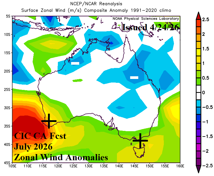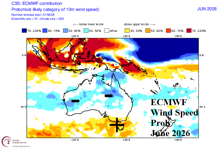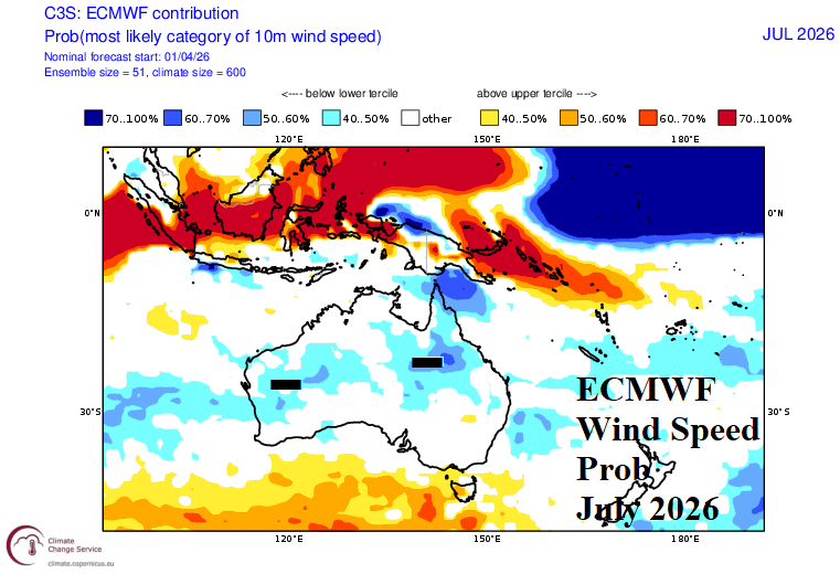 July 2026: The CIC-CA outlook favors below normal wind speeds across Queensland. Conversely, support for stronger than normal wind speeds are indicated on the West Coast of Western Australia although southwestern Australia has a sharp conflict between vigorous zonal wind and light meridional wind. Above normal wind speeds continue on the immediate Southeast Coast. ECMWF probabilistic projections maintain below normal wind speed risk except above normal wind speed risk on the Southeast Coast where forecast confidence is above average.
