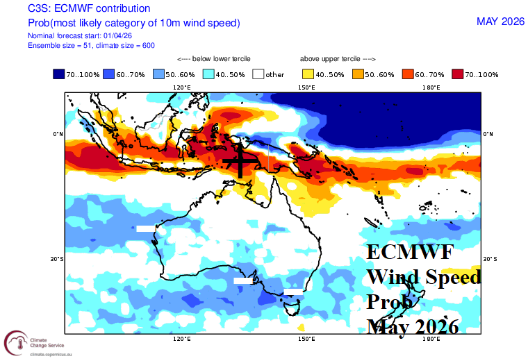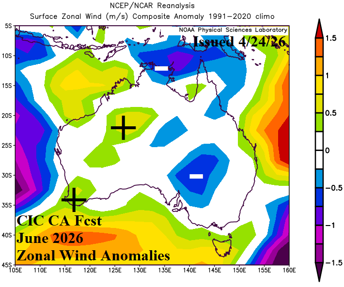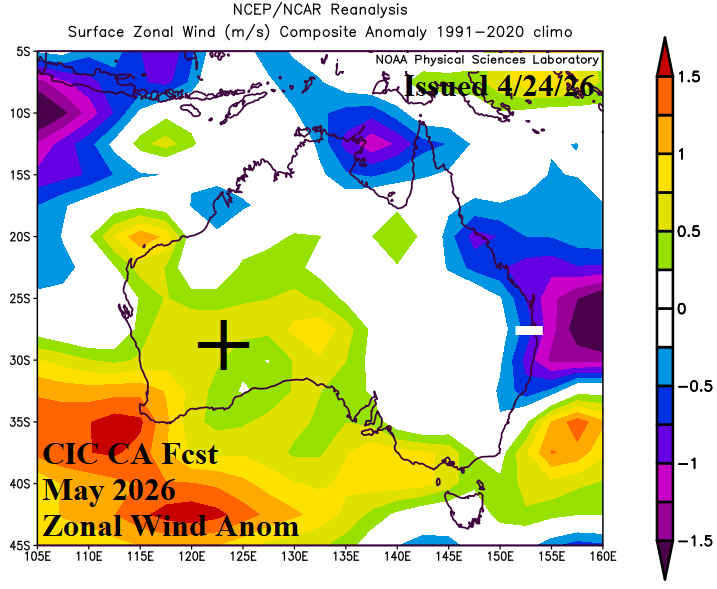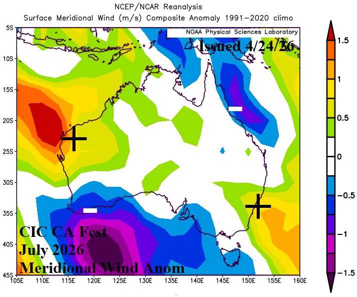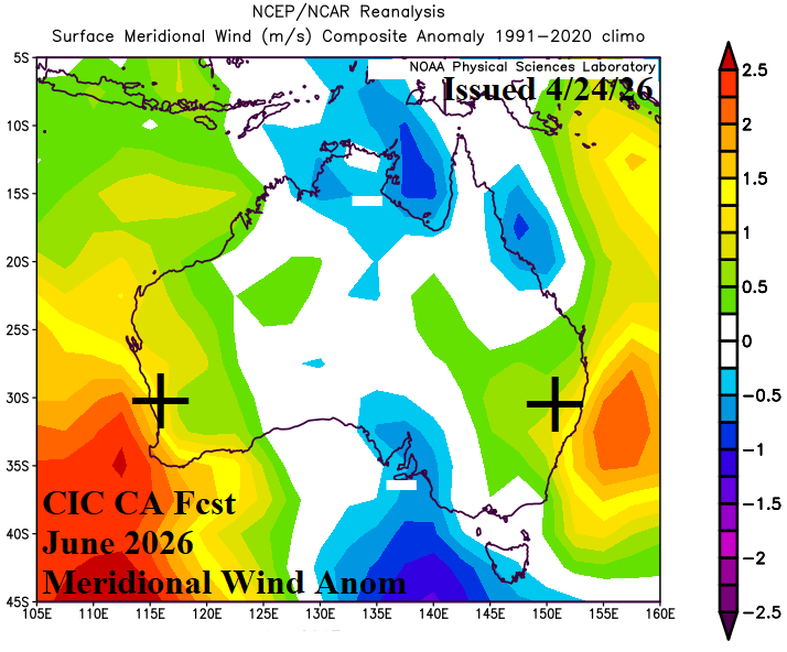 May 2026: The CIC-CA outlook favors below normal wind speeds, mainly from the north and south direction, across east and southeast continent in May. The outlook features above normal wind speeds from both zonal and meridional direction across Southwest Australia. ECMWF probabilistic forecasts favor below normal wind speeds across southern continent. The CIC-CA and ECMWF outlooks are agreeable to below normal wind speeds across the Southeast in May.
