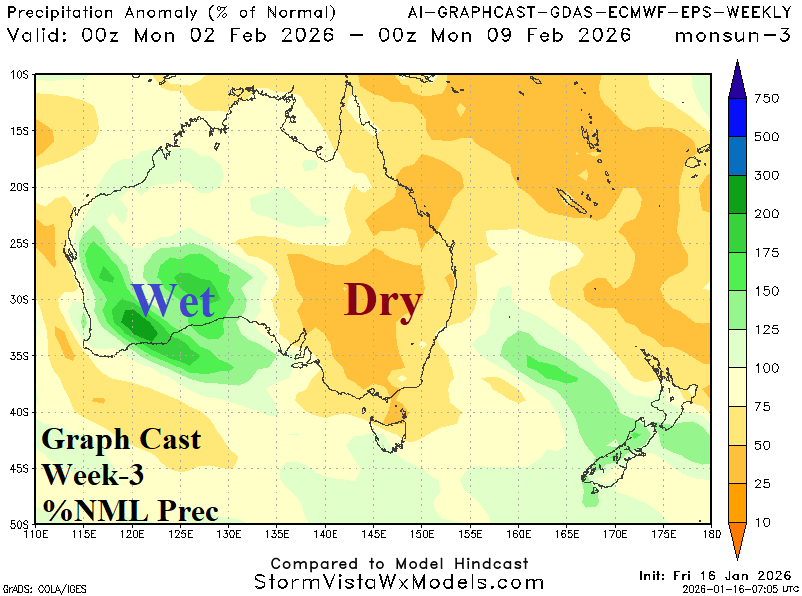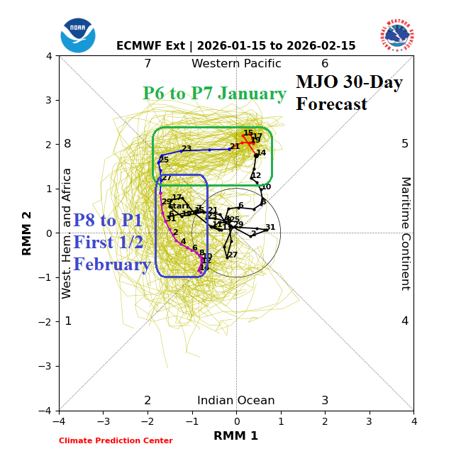 Discussion: The ECM 30-day Madden Julian oscillation forecast indicates a phase_6 to phase_7 shift with intensity the second half of January followed by a phase_8 to phase_1 shift the first half of February. The phase_8 to phase_1 shift is eastward through the longitudes of the Americas and represents a hot and dry correlation to Australia climate.