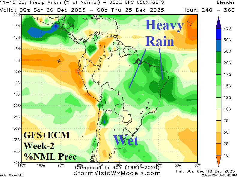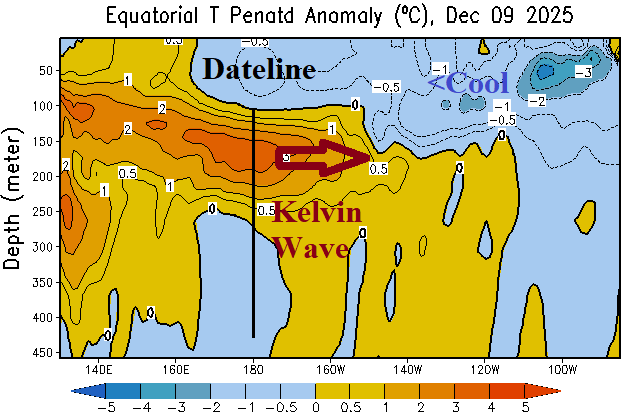 During the past week, the Nino34 and Nino3 sea surface temperature anomaly (SSTA) regions across the east-central and east equatorial Pacific Ocean cooled to the second strongest level of the weak late 2026 La Nina episode. The central equatorial Pacific and off the northwest coast of South America are near normal. Of interest is the appearance of a Kelvin Wave shifting east of the Dateline during early December.