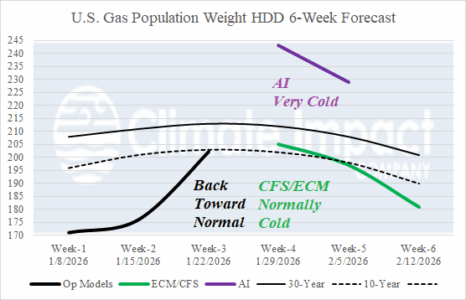 The consensus of operational models U.S. gas population weigh HDD forecasts is a trend from the early January warmth back to near normal for the week ending January 22nd. The 06Z GFS was colder than the 30-year normal. Interestingly, the ECM is colder for the second half of January across the Northern U.S. while CFS maintains the southern 2/3 of U.S. warmth. Therefore, the ECM/GFS HDD projections are near to below the 10-year normal in the extended range. However, the machine learning models are all cold to very cold for late January into early February.