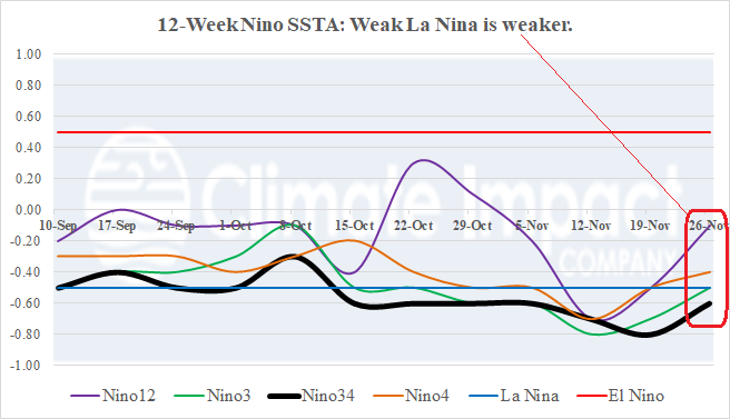 ECM indicates potential for flooding rainfall during the middle third of December across Eastern Bolivia, Paraguay, and Southwest/Southeast Brazil. The rain may abate in the 11-15-day period. The 24-hour change indicates a significant increase in rainfall for Paraguay and eastward. The culprit is an intensifying upper trough extending from east of Argentina northwestward into Brazil during much of the next 2 weeks.
