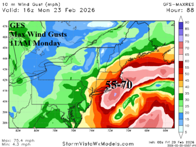 Given the low-pressure forecasts, high wind is a major issue with the SUN/MON Northeast Coastal storm. Utilizing the aggressive GFS forecast, wind gusts in the 45-65 mph range should be expected Sunday evening on the Mid-Atlantic Coast extending inland to I-95. By late Monday morning, wind gusts approach hurricane force across southeastern Massachusetts. High wind and heavy snow combination could produce blizzard conditions.
