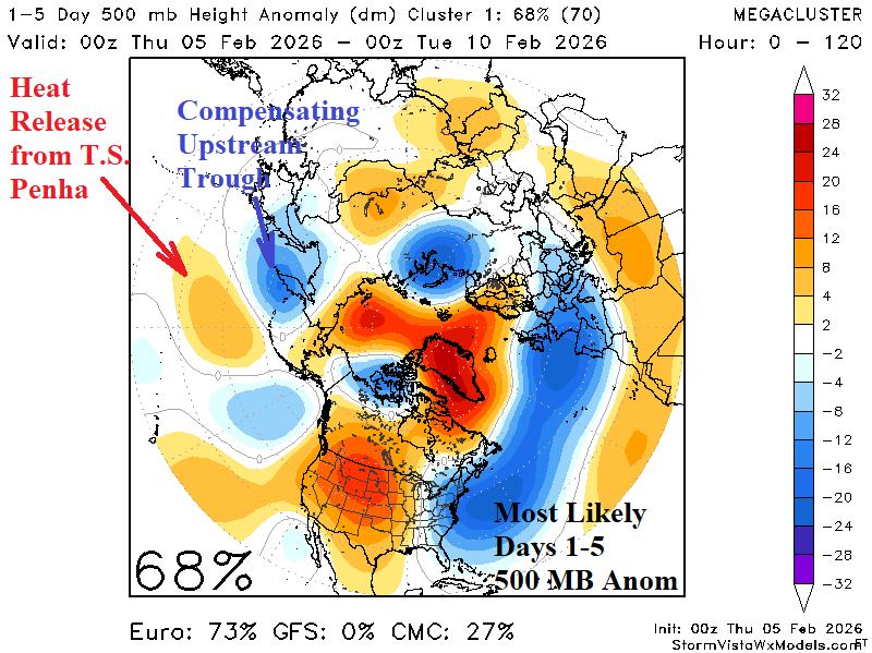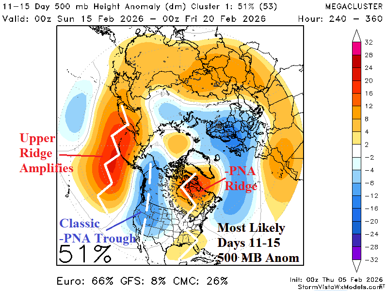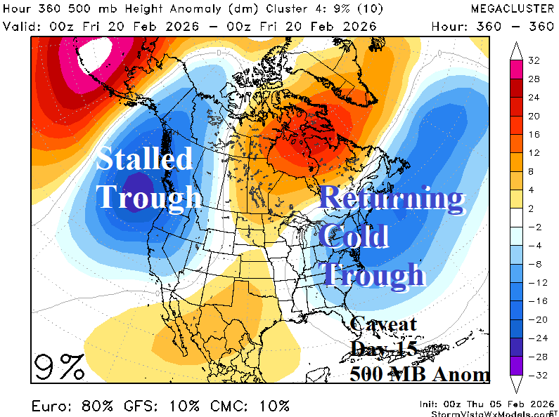 Discussion: One of the strongest climate signals during DEC/JAN/FEB representing extreme temperature across North America is the Asia/Bering Sea/North America (ABNA) index. The ABNA index 16-day forecast indicates a strong positive phase spike next week (Fig. 1) and representative of a widening anomalous warm pattern in North America. In the short-term, latent heat release from the presence of a tropical cyclone approaching the Philippines causes an upper ridge to form to the northeast south of the Aleutian Islands (Fig. 2). A compensating cold trough amplifies over Coastal Northeast Asia. In the 6-10-day period, the upper ridge crests north of Hawaii forcing Northeast Asia upper trough eastward across Alaska (Fig. 3). The upper trough beings amplifying on the North America West Coast, characteristic of a negative Pacific North America (PNA) index. Compensating for the evolving western North America trough is a warming ridge affecting most of North America. In the 11-15-day period, a full -PNA regime has evolved, and the +ABNA regime begins to weaken (Fig. 4). In the 11-15-day period a warm upper ridge rests over the eastern half of North America. The ABNA influence on North America begins over Northeast Asia. What are the potential scenarios on day-15? The mega-cluster ensemble indicates the most likely 500 MB anomaly pattern is the West Coast trough shifting toward the Central U.S. propelling a significant storm for the Great Plains (Fig. 5). Warmth in the East continues while western half of the U.S. cools. The caveat forecast is the -PNA West Coast trough is not progressive and amplifies on the West Coast while the memory of winter 2025-26 upper trough re-emerges on the East Coast (Fig. 6).