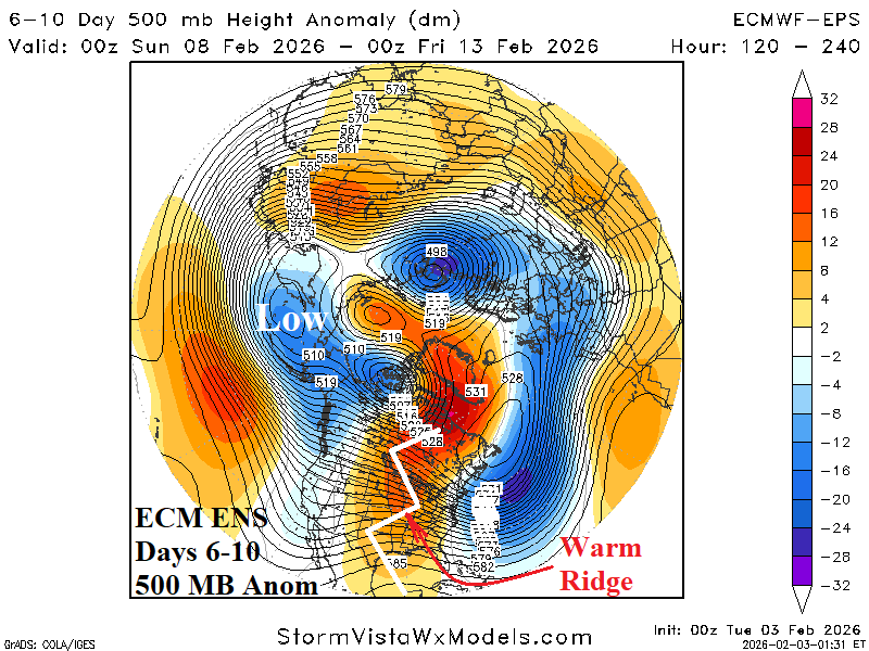 Discussion: The latest “polar vortex” winter has gripped eastern North America during much of the past 2 months and continues into early February (Fig. 1). Interestingly, JAN/FEB 2025 (also) produced a PV pattern which was centered just east of New England. During each PV episode, the polar stratosphere has been colder than normal although regional warming is present at times to assist in PV generation. The FEB-21 U.S. arctic outbreak which caused Winter Storm “Uri” was an example of a recent top-down cold event where the polar vortex extended from the stratosphere through the troposphere. As mid-February approaches, a complete reversal in the North America weather pattern is expected. ECM ENS indicates a buoyant 500 MB upper ridge from Northeast Canada to the Gulf of Mexico sure to cause a warm-up that melts snow and river ice. In the Central/East-central U.S. (Fig. 2). The “ridge bridge” high pressure over Alaska reverses to a cold upper trough. A potential trigger to the pattern change is less likely the stratosphere rather forcing caused by ocean effects. The eastern Pacific Basin is warmer than normal and warming. Note the marine heat wave (MHW) off the North America West Coast and aggressively expanding equatorward (Fig. 3), similar with warming in this location prior to the 2015-16 El Nino. The La Nina signature in the far eastern equatorial Pacific Ocean has dissipated. During January, a subsurface warm Kelvin Wave shifted across the equatorial East Pacific (Fig. 4) recently reaching the northwest coast of South America. The Nino12 region off the northwest coast of South America warmed 1.1C during the past 30 days. The majority of global SSTA forecast models are forecasting El Nino onset during northern hemisphere spring. The onset of that ENSO change has occurred and may have contributed to the sensible weather pattern change across North America as mid-February approaches.