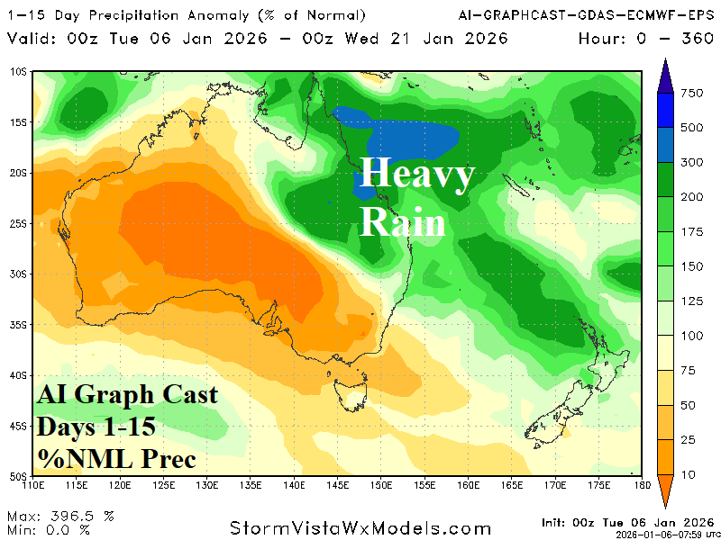 Fig. 5-6: AI Graph Cast percent of normal 15-day rainfall forecasts for Australia and South America.