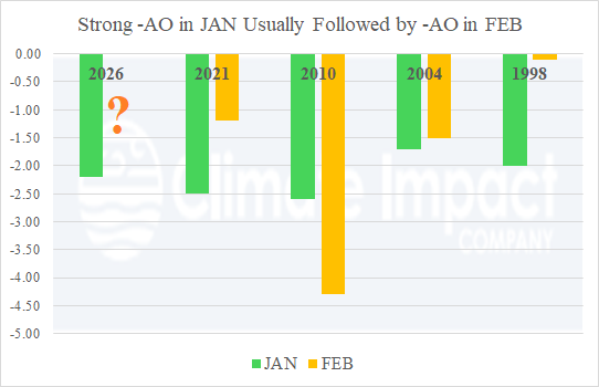 Discussion: The daily arctic oscillation (AO) spikes to a whopping -5 early next week and very supportive of the coldest late January on record for this century across the Central and East U.S. The projected AO value for JAN-26 is -2.2, possibly stronger. The last 4 months of January with similar strong negative phase signatures are 2021, 2010, 2004, and 1998 (Fig. 1). -AO was maintained the following February (except 1998). The FEB -AO analog years indicate another cold month with a strong South/East storm track (Fig. 2-3).