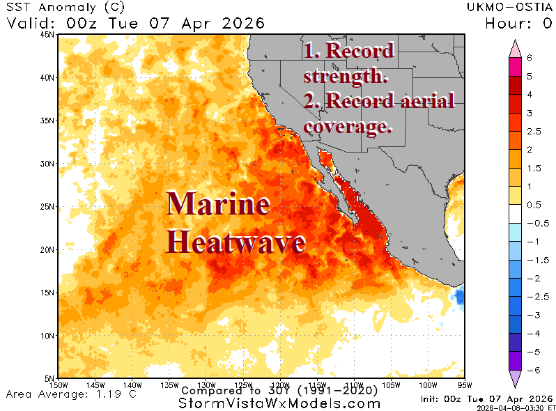 Fig. 1: Daily sea surface temperature anomaly (SSTA) analysis of ocean temperatures off the California and Baja California Coast identify a record strength and intensifying marine heat wave (MHW).