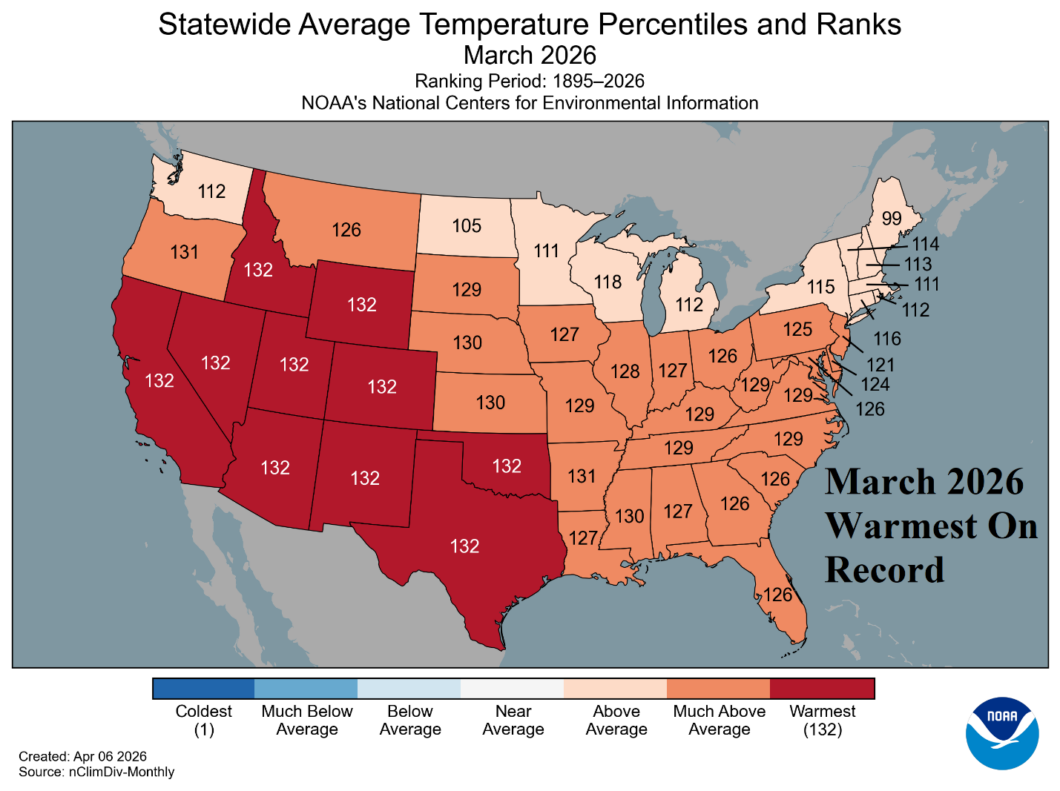 Fig. 2: NOAA state temperature rankings for March 2026.