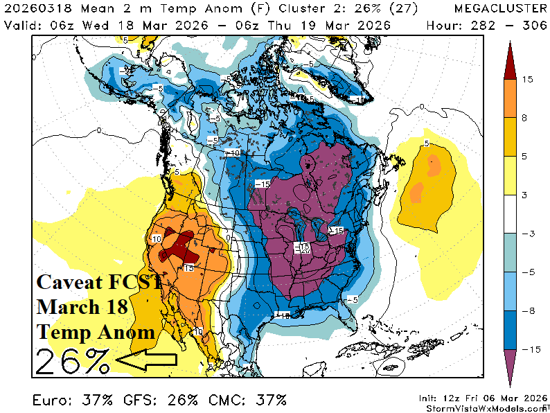 Discussion: At midday, 7 of 14 forecasts (combining dynamic and AI models) are cold in the East during the 11-15-day period. ECM OP and Weather Next V2 appear coldest while GFS OP is warmest. Support from climate signals to substantiate the cold forecast is poor. Cold East U.S. solutions given moderate strength arctic oscillation and North Atlantic oscillation are difficult to generate. The mega-cluster ensemble “most likely” March 17th scenario is heavily biased by ECM which supports vigorous chill in the East and equally impressive warmth over Nevada (Fig. 1). ECM, GFS, and CMC are near equally shared to generate a “caveat” forecast for March 18 which is very cold across the eastern half of the U.S. (Fig. 2). The only explanation is release of energy in the troposphere as the stratosphere flips from warmer than normal toward normal in the 8-14/11-15-day period. Although unsubstantiated, 50% of the operational models showing a colder scenario require (weekend) monitoring. Climate Impact Company prefers the ECM ENS/AIFS ENS which is moderately cold throughout the East U.S. in the 11-15-day period.