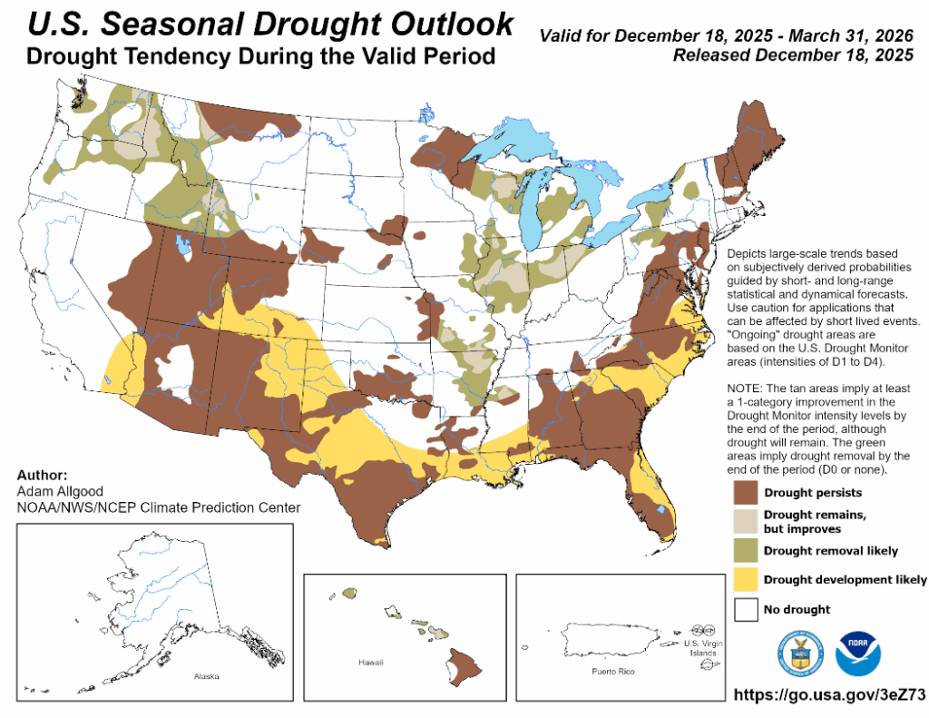 NOAA long-lead: South/Southeast drought expansion, La Nina biased cold risk Northwest U.S. and stormy Northwest/Ohio Valley through Q1/2026.