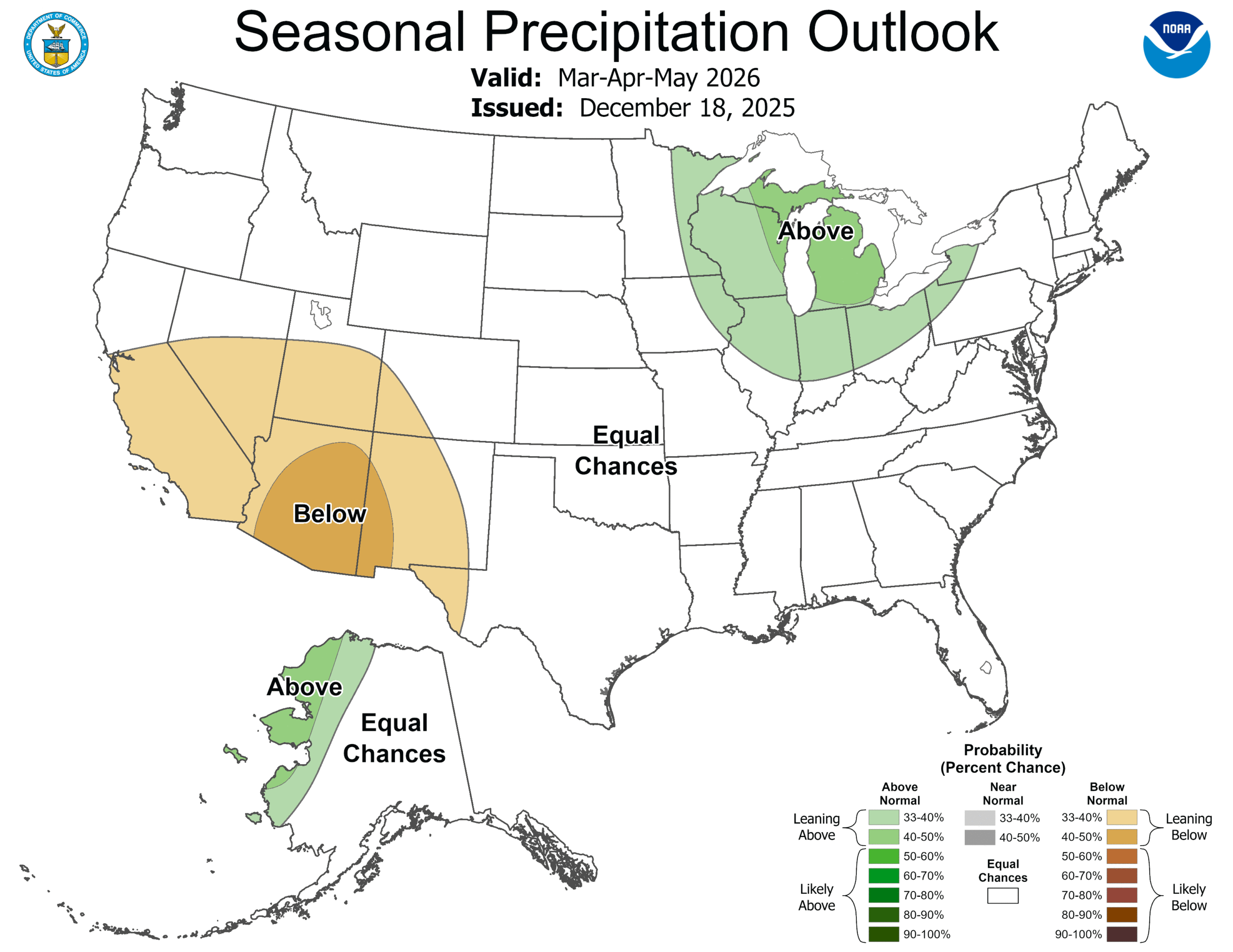 During meteorological spring, the warm risk advances northward to include California and the South U.S. plus the Eastern States (Fig. 6). The spring precipitation outlook is made with below normal confidence due to the “springtime climate prediction barrier” and a transition in the ENSO cycle. Only the Great Lakes region (wet) and Southwest (dry) have precipitation prediction probabilities (Fig. 7).